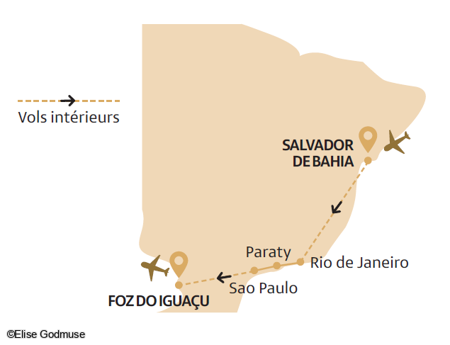 - Les vols internationaux Paris / Salvador de Bahia – Iguaçu / Paris via São Paulo en classe économique avec Air France / KLM ou autre compagnie aérienne. Un bagage en soute par personne inclus.